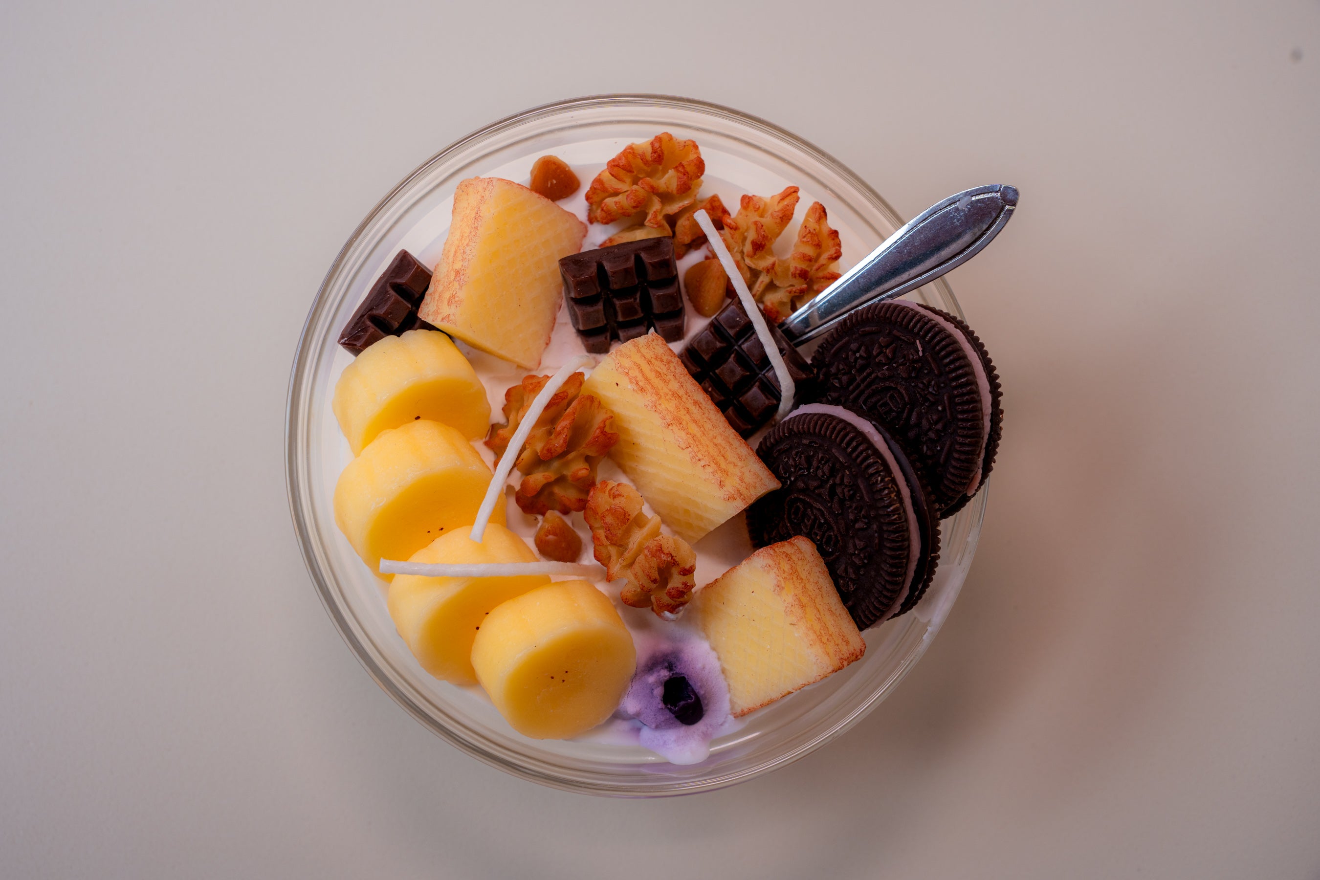 Zato smo sestavili kolekcijo, ki temelji na kakovosti, estetiki in subtilnem presežku. Vsaka sveča je ročno vlita iz 100 % sojinega voska in oblikovana v podobi priljubljenih sladic, zajtrkov ali osvežilnih pijač.